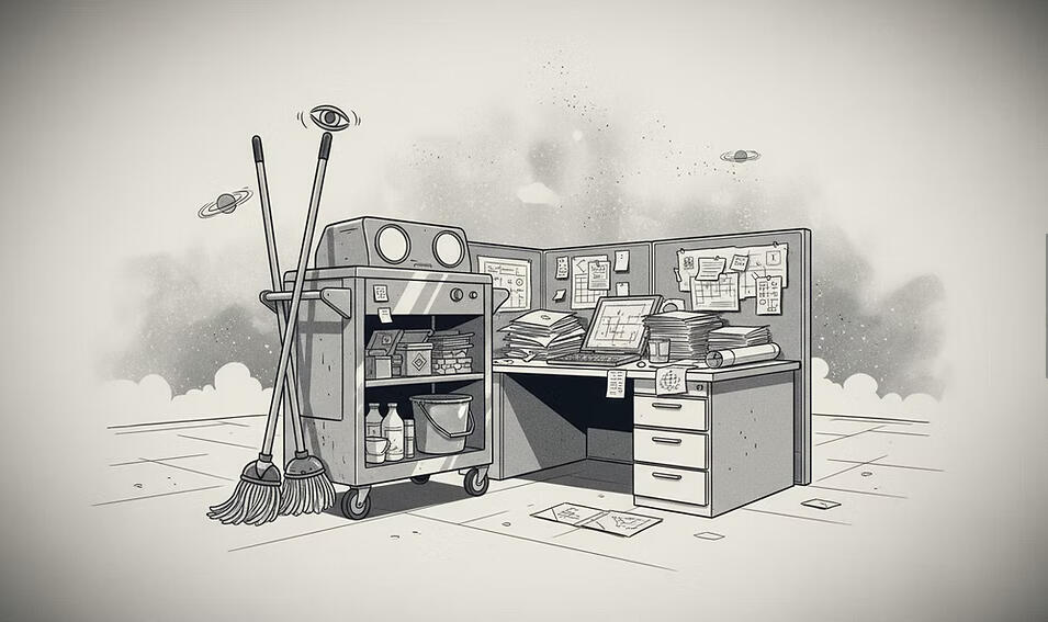 Residual Cleanup & Thought DebrisResponsible for emotional spills, half-finished thoughts, and conversations that “went fine.”Empties trash labeled Later.